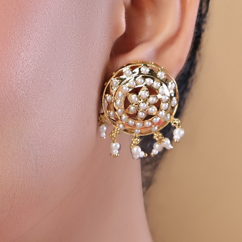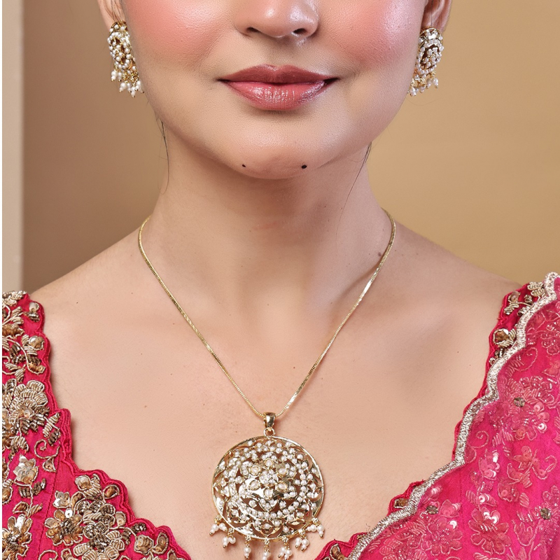 The Pearl Blossom Kundan Pendant Set is an exquisite piece inspired by classic royal craftsmanship. Featuring sparkling white and off-white kundan-style stones arranged in elegant floral and circular patterns, this pendant set radiates timeless beauty. Accented with delicate white beads, it adds a soft, graceful touch that enhances the overall design. The pendant hangs on a finely crafted chain and is paired with matching earrings for a complete, harmonious look. Perfect for weddings, festive occasions, and special celebrations, this lightweight yet luxurious set complements traditional attire with finesse, making it a sophisticated statement piece that exudes elegance and charm.