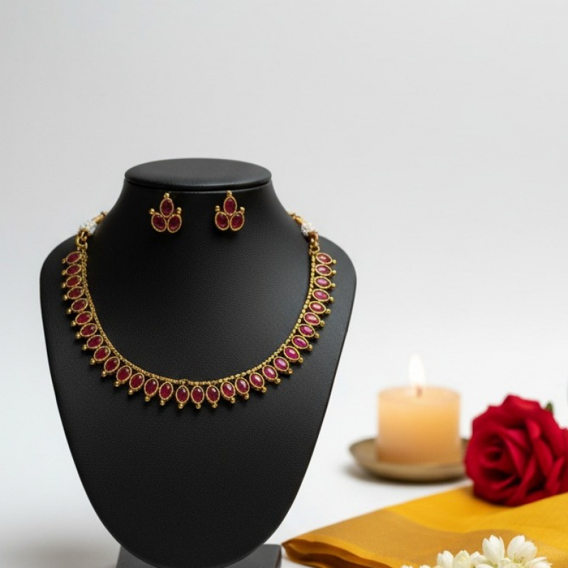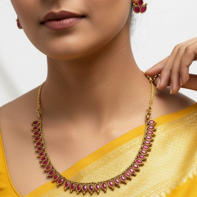 Grace your look with this timeless and elegant necklace set crafted in a delicate gold-tone finish. Featuring a series of soft blush pink teardrop stones beautifully framed in intricate gold detailing, this necklace creates a refined and feminine appeal. The evenly spaced stone arrangement adds a balanced and sophisticated charm, while the matching stud earrings complete the look effortlessly. Perfect for festive gatherings, family functions, and wedding celebrations.