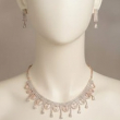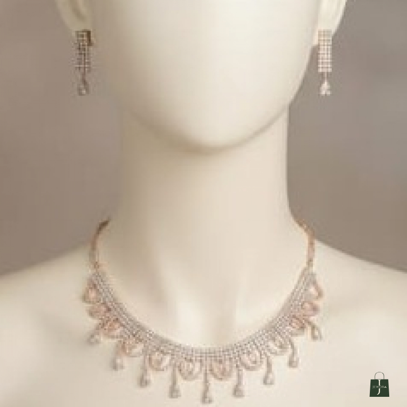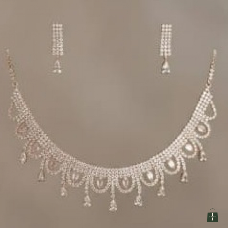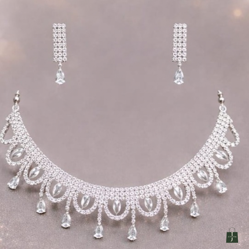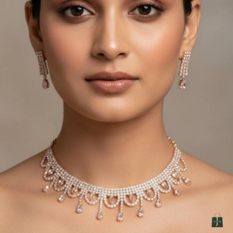 A graceful and feminine choker set designed with shimmering white stones arranged in delicate oval loop patterns. The lower edge is adorned with sparkling teardrop danglers that add gentle movement and refined charm. Paired with matching drop earrings featuring crystal accents and pear-shaped stone drops, this set creates a sophisticated yet subtle statement. Perfect for engagements, receptions, festive gatherings, and wedding functions, it enhances both traditional and modern attire effortlessly.