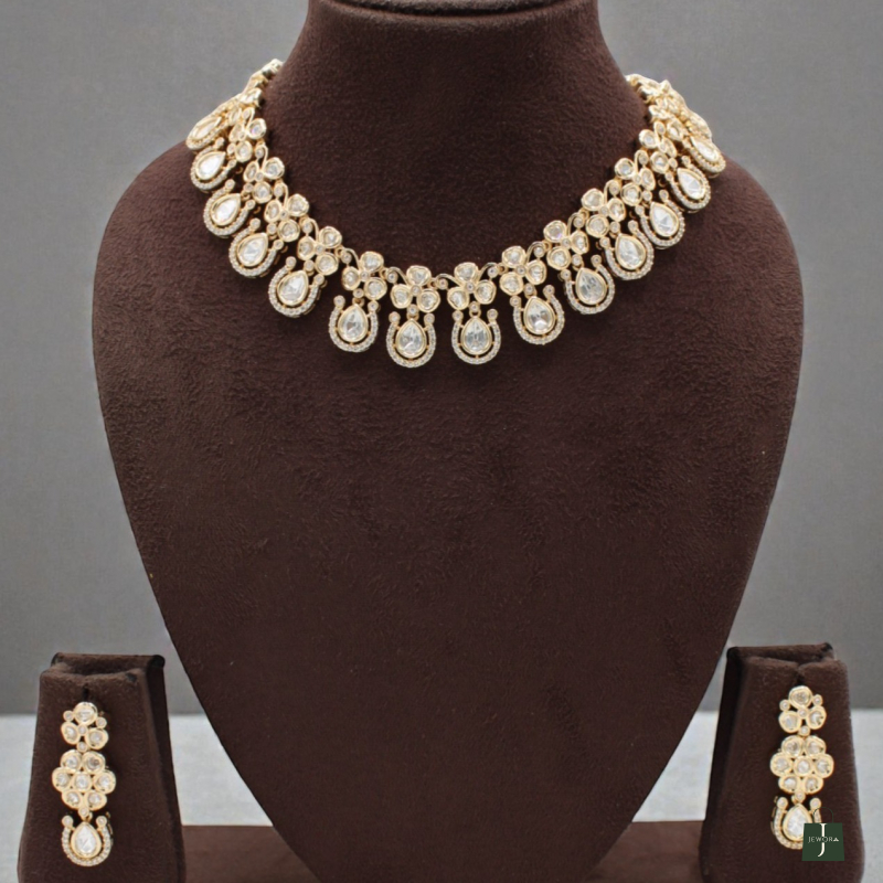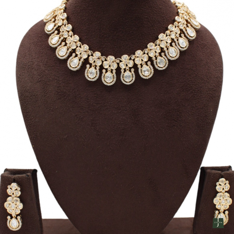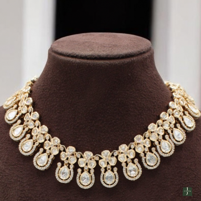 Enhance your traditional look with this beautifully crafted Kundan necklace set featuring delicate teardrop patterns arranged in a flowing layered design. The necklace showcases sparkling white Kundan stones set in a rich gold base, creating a refined and luxurious appeal.