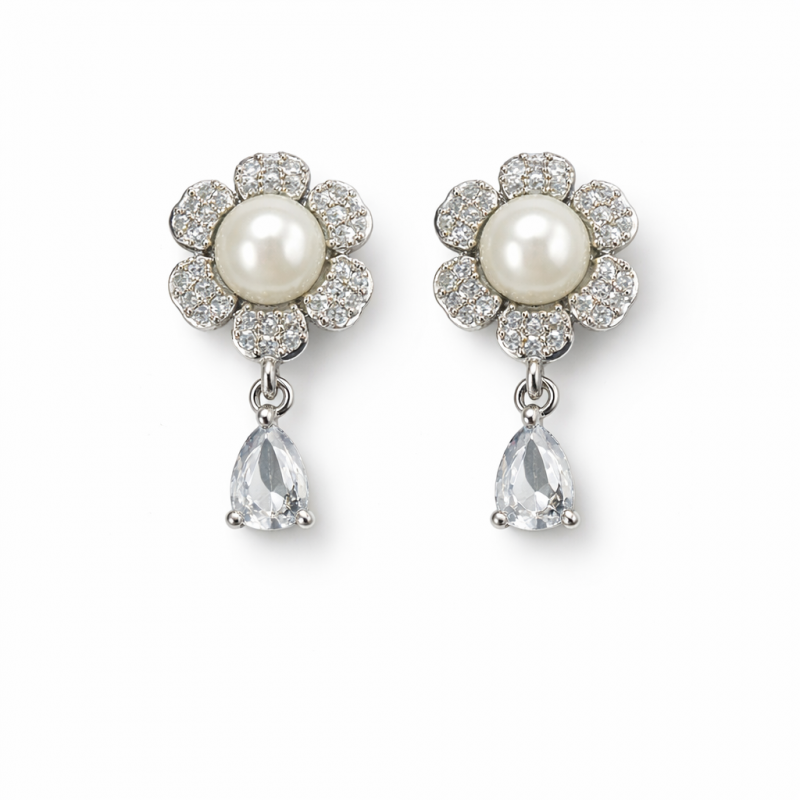 Enhance your beauty with these graceful pearl flower drop earrings Designed with a delicate floral pattern and sparkling drop accent, these earrings bring a classy and modern touch to any outfit. Made from premium quality material, they are perfect for both daily styling and special occasions.