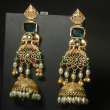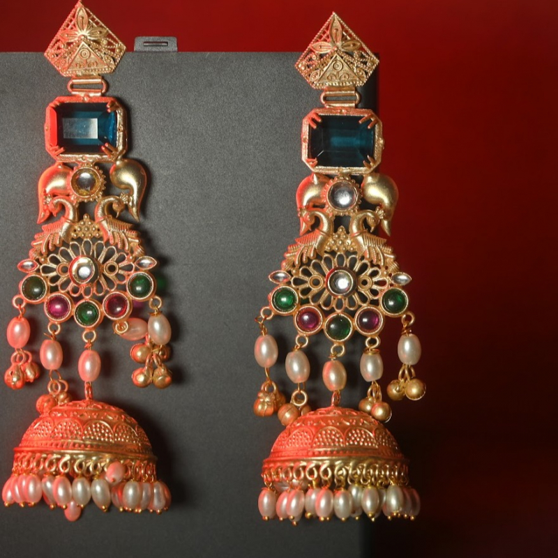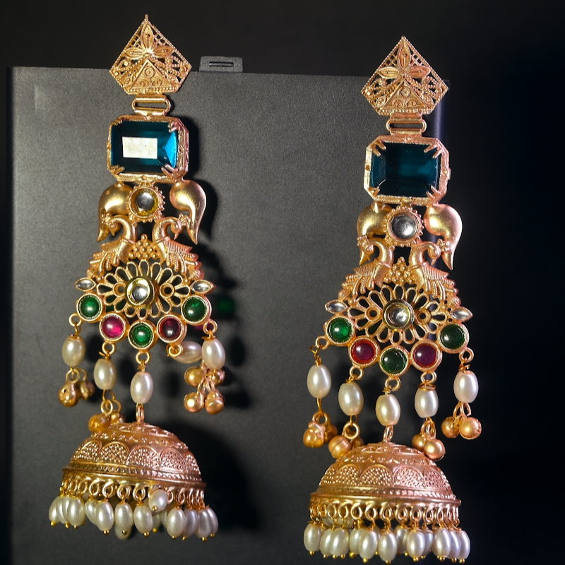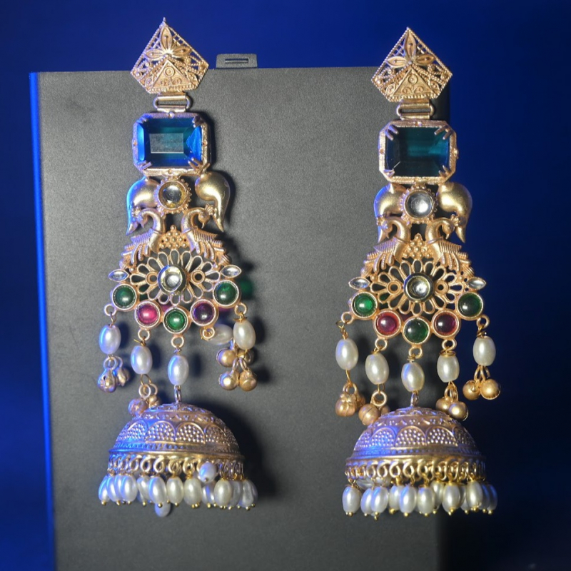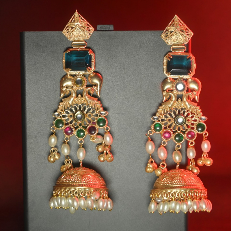 Elevate your festive and wedding look with these stunning royal jhumka earrings from Trinaari. Crafted with intricate detailing and a rich antique gold finish, this pair beautifully blends traditional craftsmanship with statement elegance.