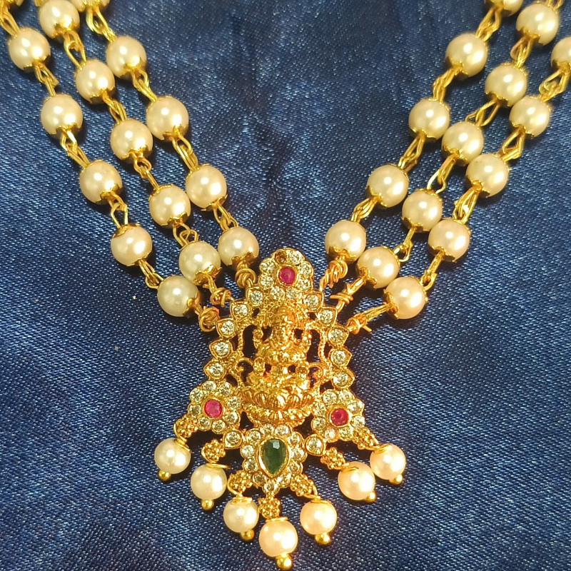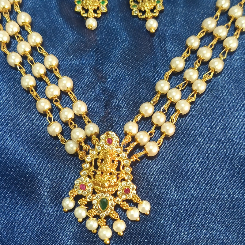 This Jewellery is a Traditional South Indian temple Style Lakshmi Pendant Pearl Choker Necklace,Often featuring gold-plated craftmanship and cubic zirconia stones Combined with Earrings of Premium Quality at Affordable price