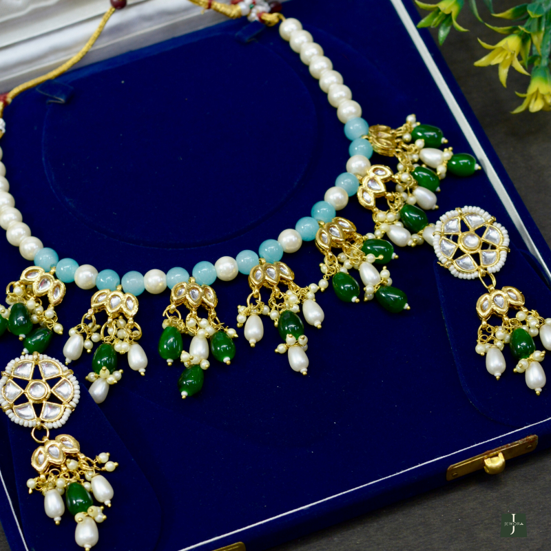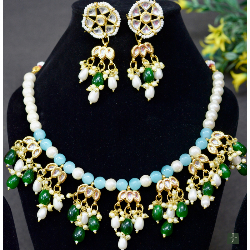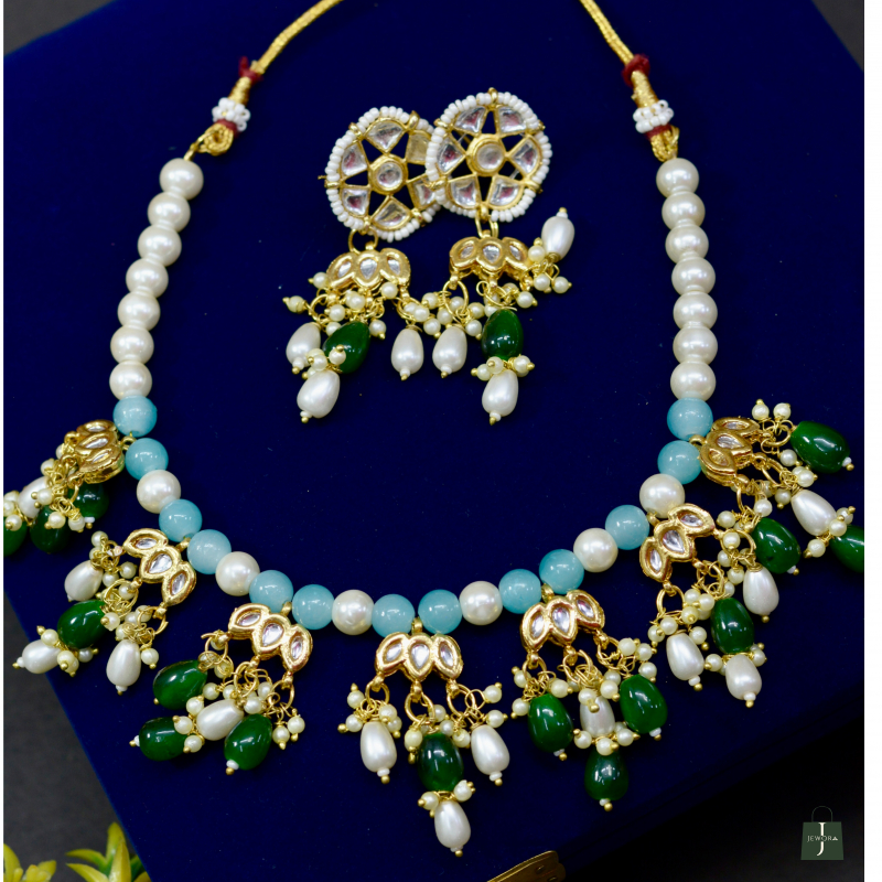 Blending pearls with multicolor beads and classic Kundan work, this necklace offers vibrant elegance with a refined finish. The harmonious color combination and craftsmanship create a premium appearance, making it suitable for festive wear, celebrations, and versatile ethnic styling at an accessible price.