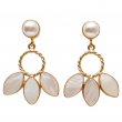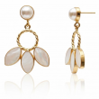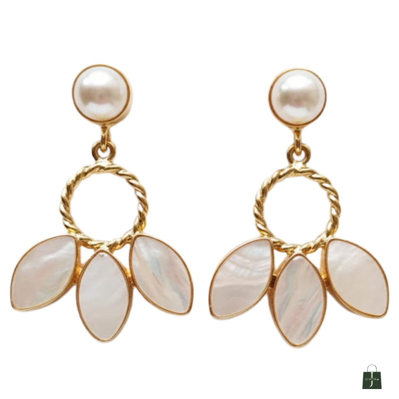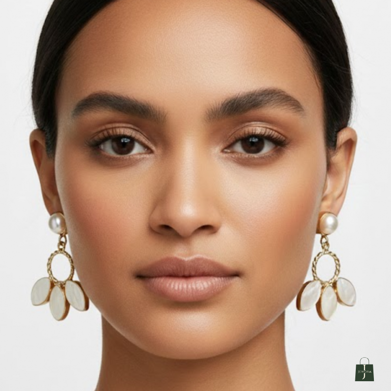Elegant pearl stud earrings paired with a golden twisted ring and delicate white petal charms. A soft, feminine statement piece perfect for any occasion.