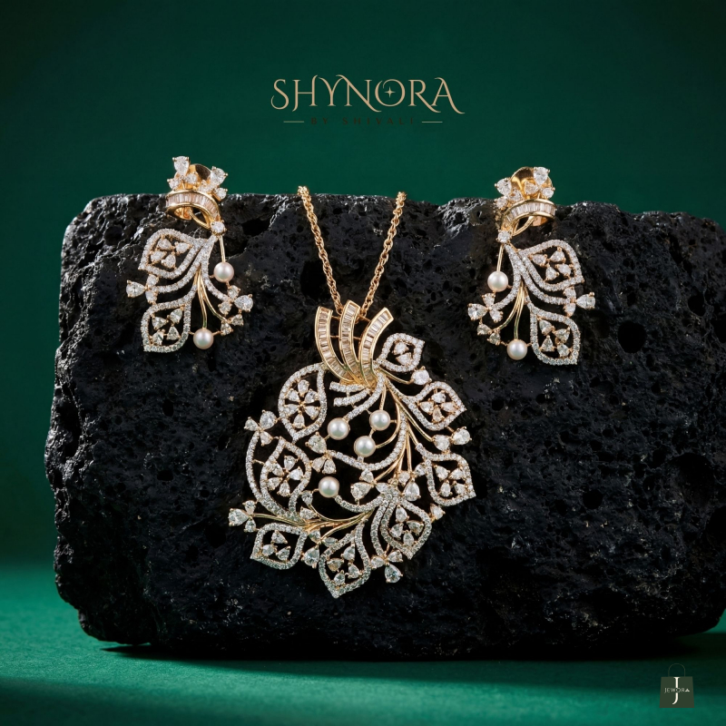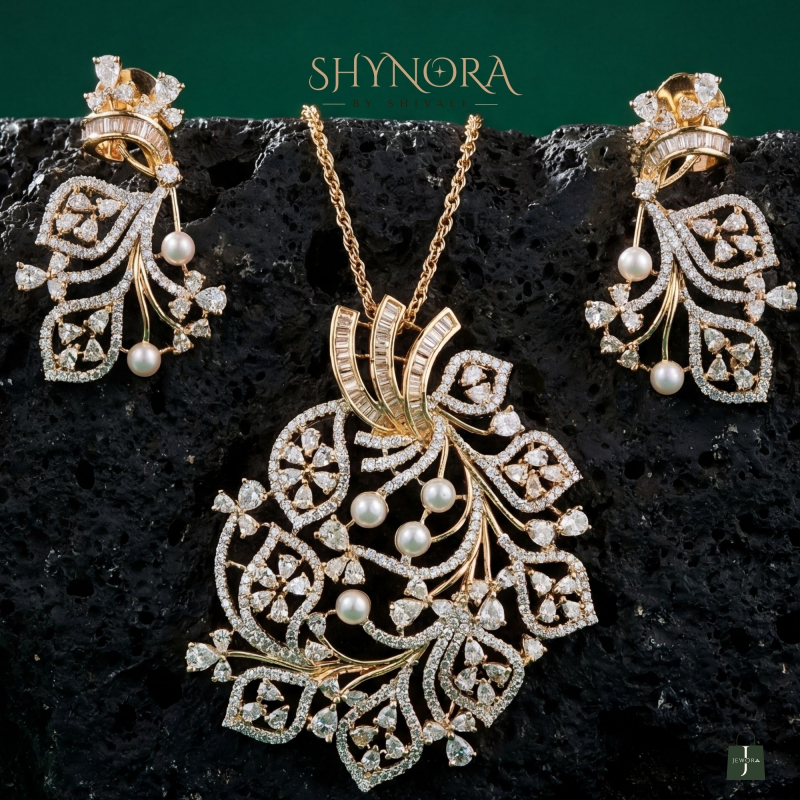 The Pearl Whirl Diamond Pendant Set is a striking blend of fluid motion and classic elegance. Designed with swirling leaf and vine motifs, the pendant showcases brilliant diamond-look crystals delicately arranged around soft pearl accents, creating a graceful sense of movement and depth. The layered curves and fine detailing give this piece a luxurious, couture-inspired appeal.