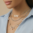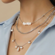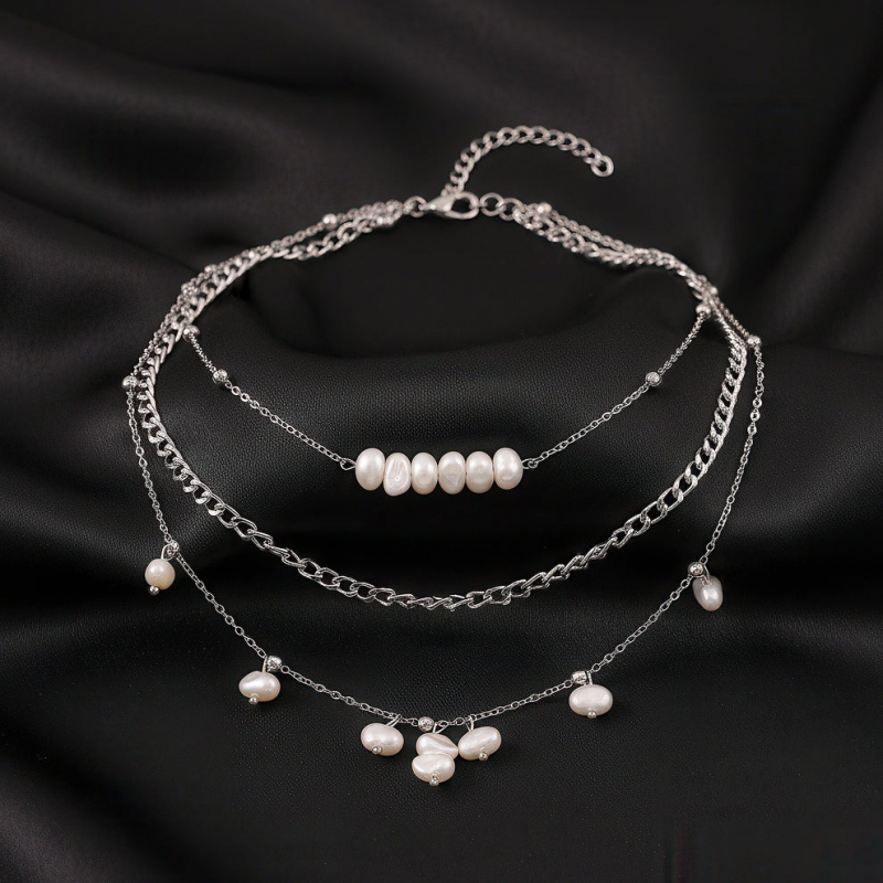 Shimmering silver-toned chains are adorned with uncut pearl accents, each pearl catching light with a natural, understated glow. The layered composition feels fluid and balanced, bringing together modern finesse and timeless charm in a way that feels effortlessly refined.