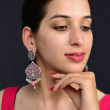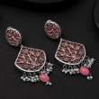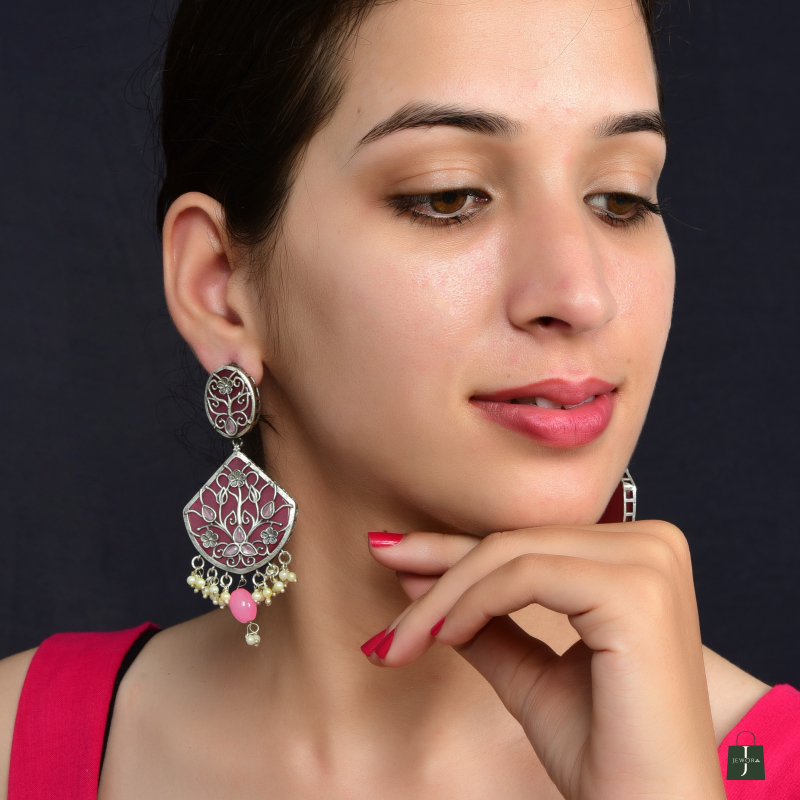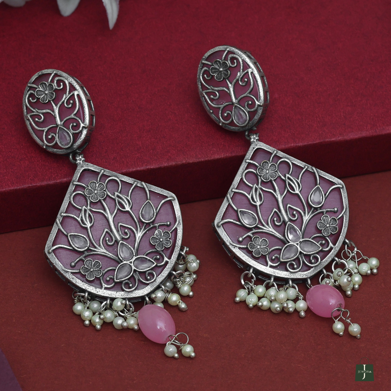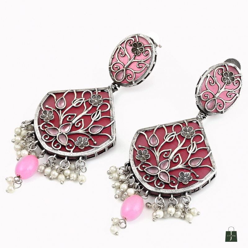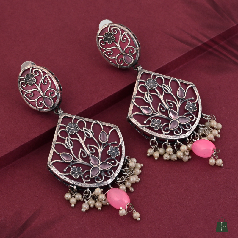 Oxidized silver earrings with floral filigree, pink enamel, and pearl dangles—perfect for festive looks.