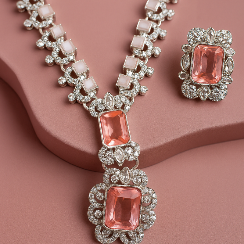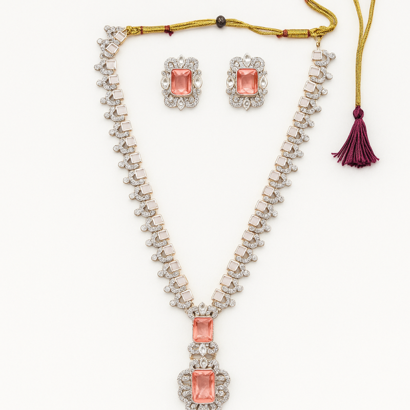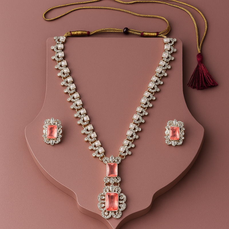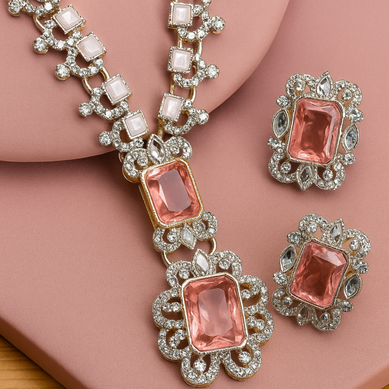This Elegant Pink Stone Necklace Set is designed to radiate sophistication and timeless beauty. The centerpiece features striking rectangular pink stones, framed by shimmering American Diamond (CZ) accents, adding a perfect blend of color and sparkle. The necklace is crafted with precision, offering a structured yet graceful design that pairs beautifully with both festive attire and bridal ensembles. The matching earrings complete the look, making this set an exquisite choice for weddings, celebrations, and evening gatherings.
