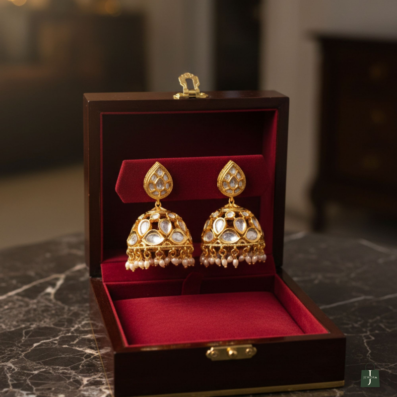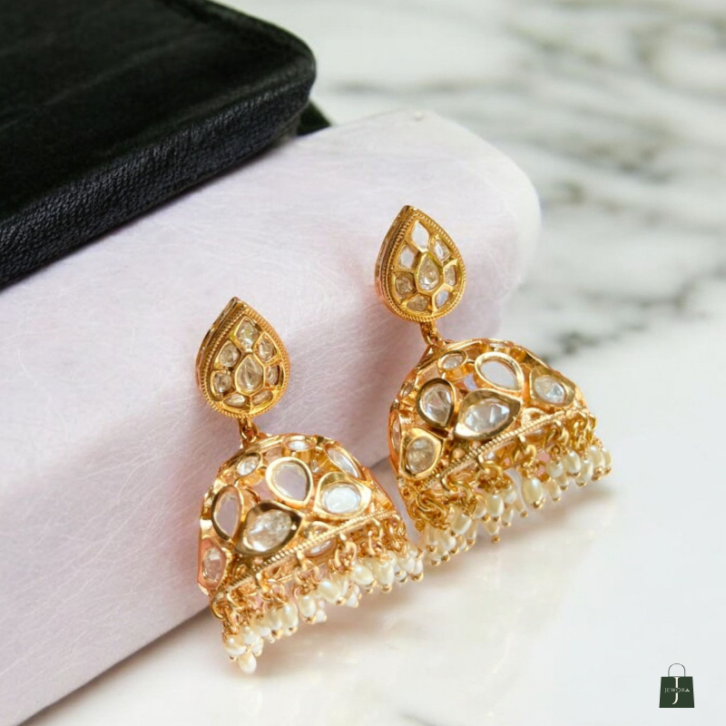 Inspired by heritage Indian jewellery, these polki jhumkis are perfect for weddings, festive occasions, poojas, and traditional celebrations. Pair them effortlessly with sarees, lehengas, silk suits, or anarkalis for a regal ethnic statement.
