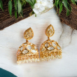 Elevate your ethnic look with these exquisite Polki Jhumki Earrings, crafted in a rich gold-tone finish and adorned with classic polki-style stones. Designed in a traditional dome-shaped jhumki silhouette, these earrings are finished with delicate pearl drops that add graceful movement and timeless elegance.