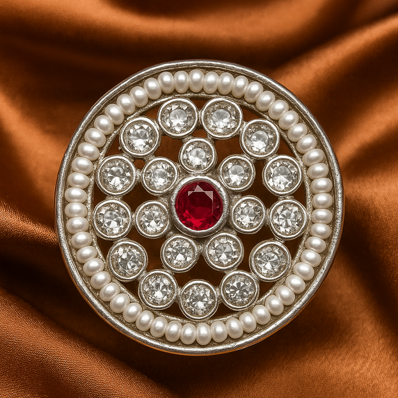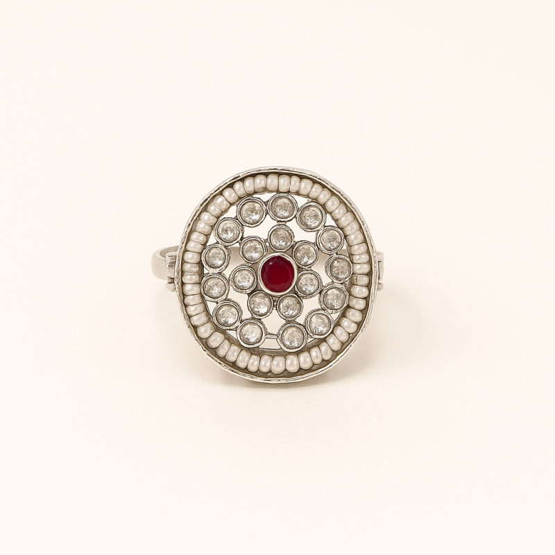 Crafted from premium alloy and polished in silver, this ring combines durability with heritage artistry. The detailed Kundan setting and fine Polki stones reflect timeless design traditions, while the adjustable free-size band ensures comfort and versatility. Its elegant design makes it a versatile addition to any festive or wedding jewellery collection.