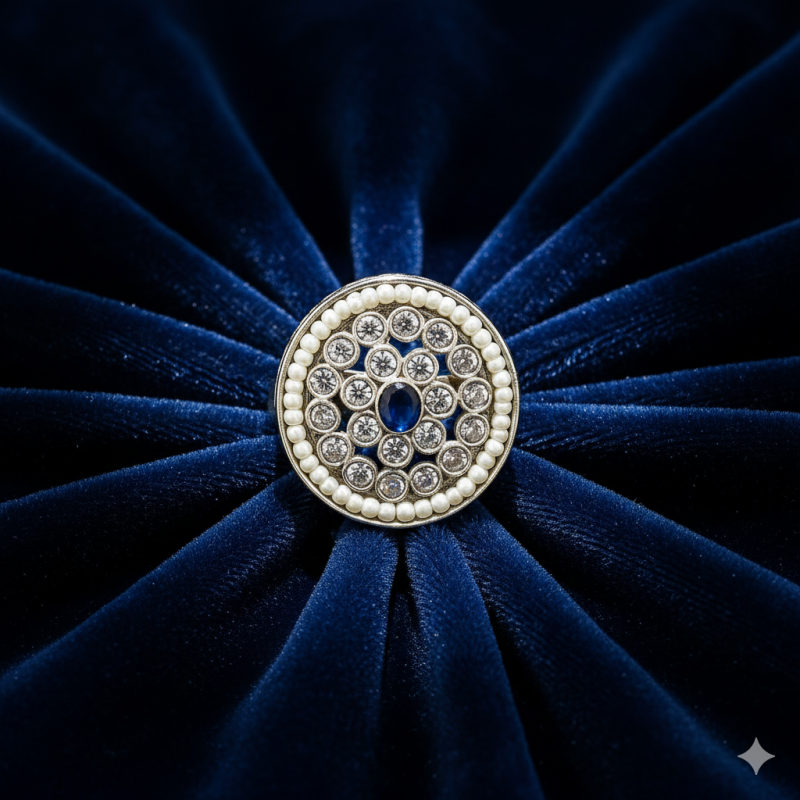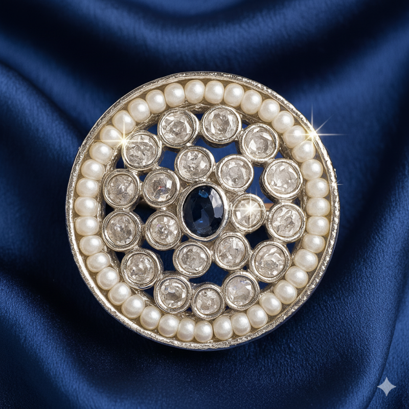 Crafted from premium alloy and polished in silver, this ring combines durability with heritage artistry. The detailed Kundan setting and fine Polki stones reflect timeless design traditions, while the adjustable free-size band ensures comfort and versatility. Its elegant design makes it a versatile addition to any festive or wedding jewellery collection.