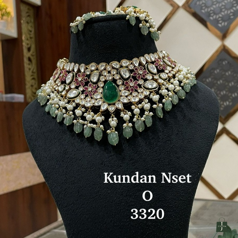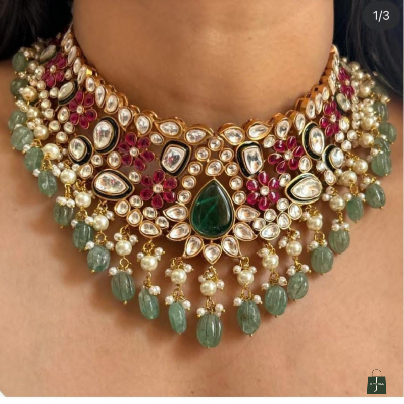 Turn heads and steal hearts with this luxurious Kundan Choker Necklace, designed for women who love statement elegance. Richly handcrafted with polki kundan stones, ruby-toned floral accents, luminous pearls, and serene green bead drops, this masterpiece reflects true bridal royalty.