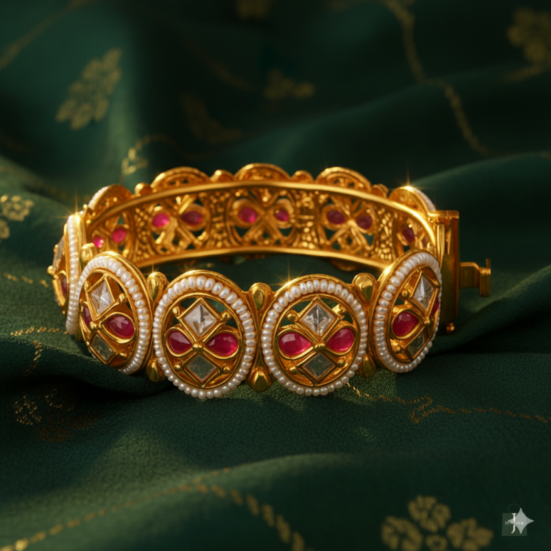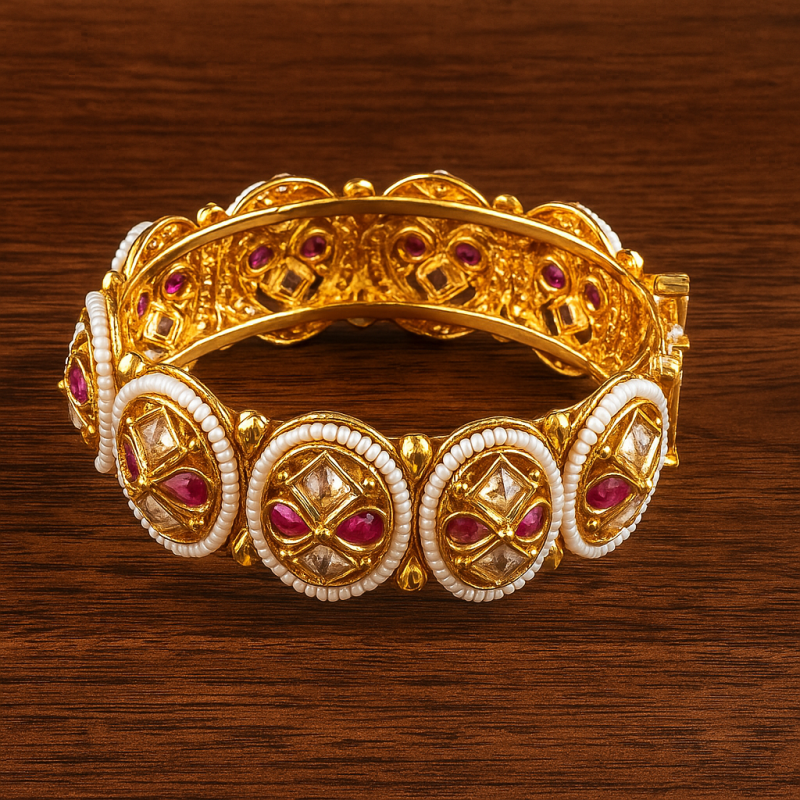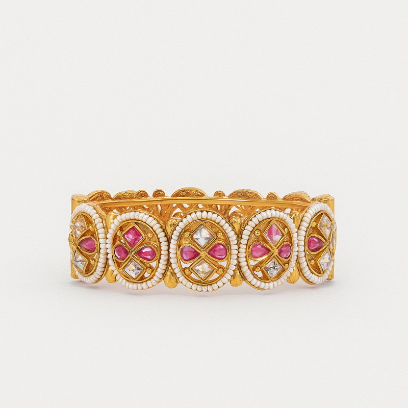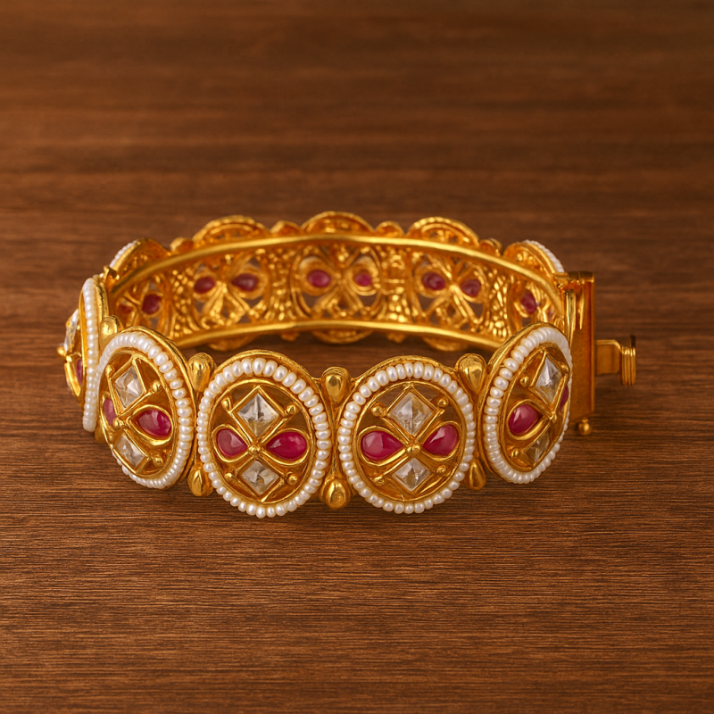 The Polki Ruby Circle Kada Bangle is a timeless masterpiece blending heritage craftsmanship with modern elegance. Adorned with ruby red stones and American Diamond (CZ) accents, each circular motif is bordered with delicate pearl-like beading that enhances its regal appeal. Crafted in gold polish with intricate Kundan work, this kada is perfect for festive and bridal occasions, exuding richness and tradition. Designed with a secure screw closure, it offers both comfort and luxury, making it a must-have statement piece in every womanโs collection.