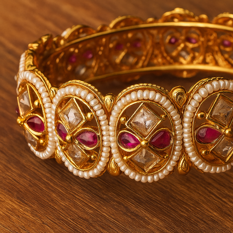 The Polki Ruby Circle Kada Bangle is a timeless masterpiece blending heritage craftsmanship with modern elegance. Adorned with ruby red stones and American Diamond (CZ) accents, each circular motif is bordered with delicate pearl-like beading that enhances its regal appeal. Crafted in gold polish with intricate Kundan work, this kada is perfect for festive and bridal occasions, exuding richness and tradition. Designed with a secure screw closure, it offers both comfort and luxury, making it a must-have statement piece in every womanโs collection.