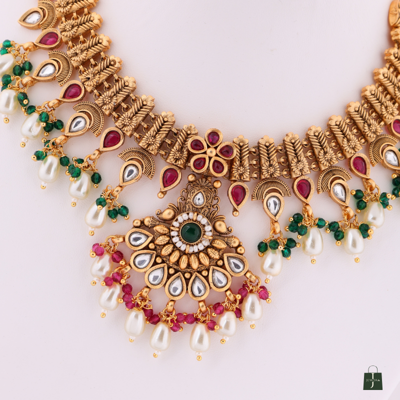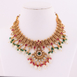 PREESAA'J Rajwadi Royal Gold Plated Temple Jewellery Choker Necklace Set with Matching Earrings and Mangtika for Women | Traditional Kundan Style Red Green Stones & Pearl Drop Bridal Jewellery