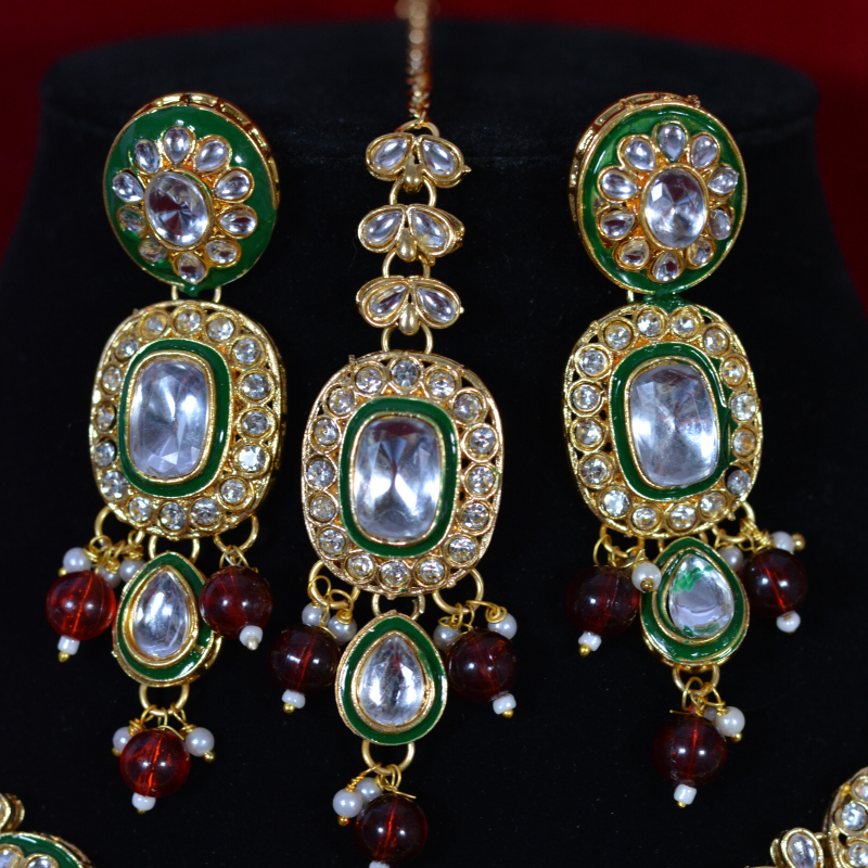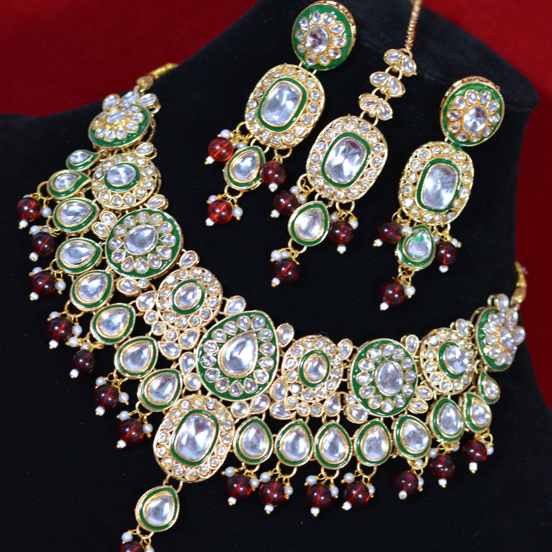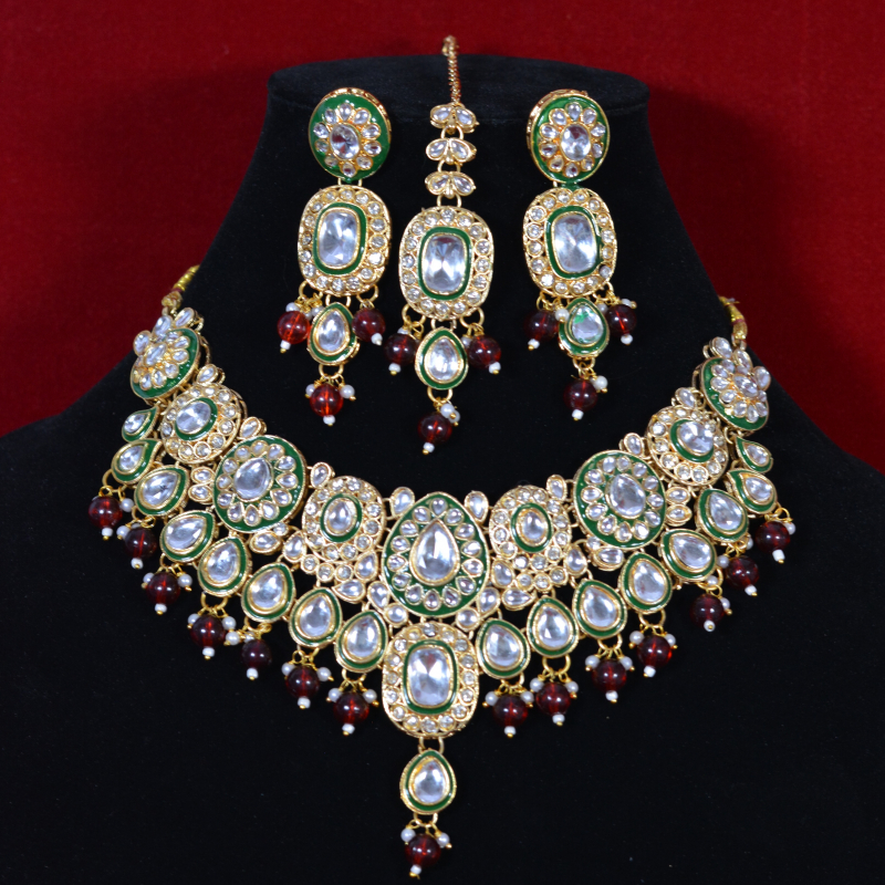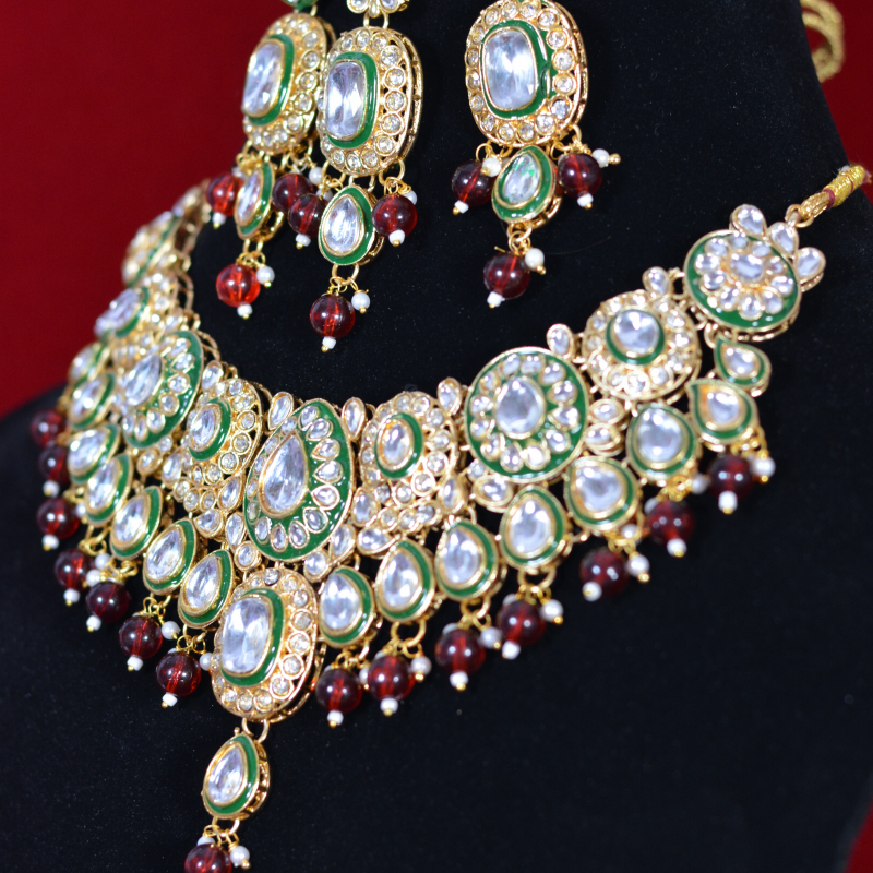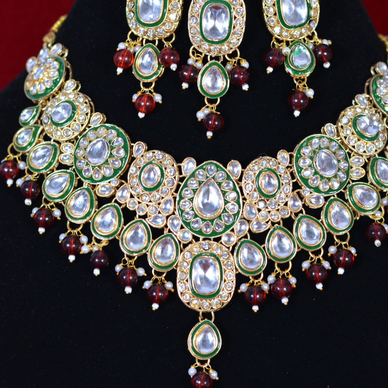 This necklace set presents layered polki-style kundan stones outlined with green enamel accents. Deep red bead drops add richness and traditional character to the design. The intricate stone placement, floral-inspired motifs, and polished gold-toned framework together create a bold yet balanced statement with strong bridal visual appeal.