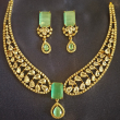 This Jewellery set is a Matte Finish Gold Platted choker Necklace featuring Emerald green and white AD CZ stone-Studded Details typically includes a matching Earrings and is designed for occassions such as parties and festivities.