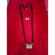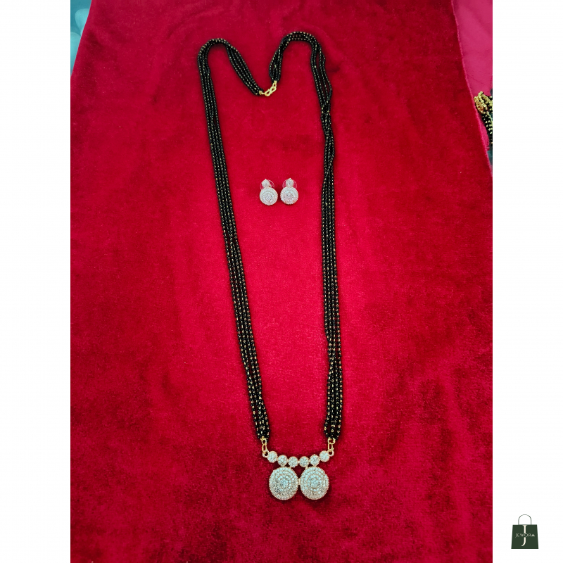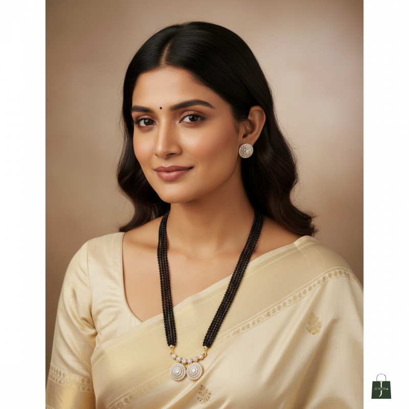 This premium multi-layer mangalsutra features four strands of classic black beads paired with an elegant pearl-studded pendant. The circular double-drop pendant is beautifully embellished with sparkling stones, adding a graceful touch to your traditional look. Paired with matching stone-studded stud earrings, this set blends modern sophistication with cultural charm. Perfect for festive occasions, weddings, and everyday elegance, it enhances any ethnic outfit effortlessly.