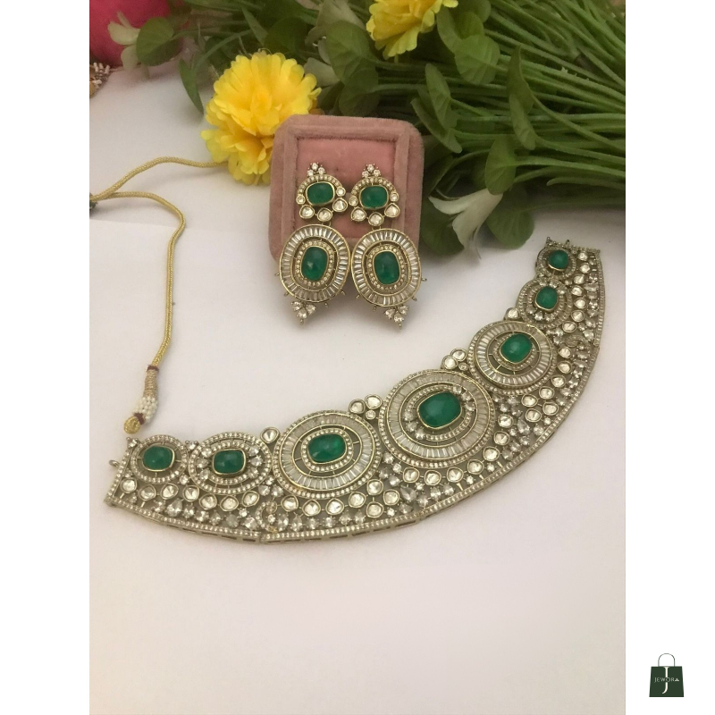 Elevate your festive and bridal look with this Exquisite Polki Choker Necklace Set, crafted for lovers of understated luxury. Designed with shimmering polki stones, intricate detailing, and available with ivory polki or emerald-green center stones, this set blends heritage craftsmanship with contemporary finesse.