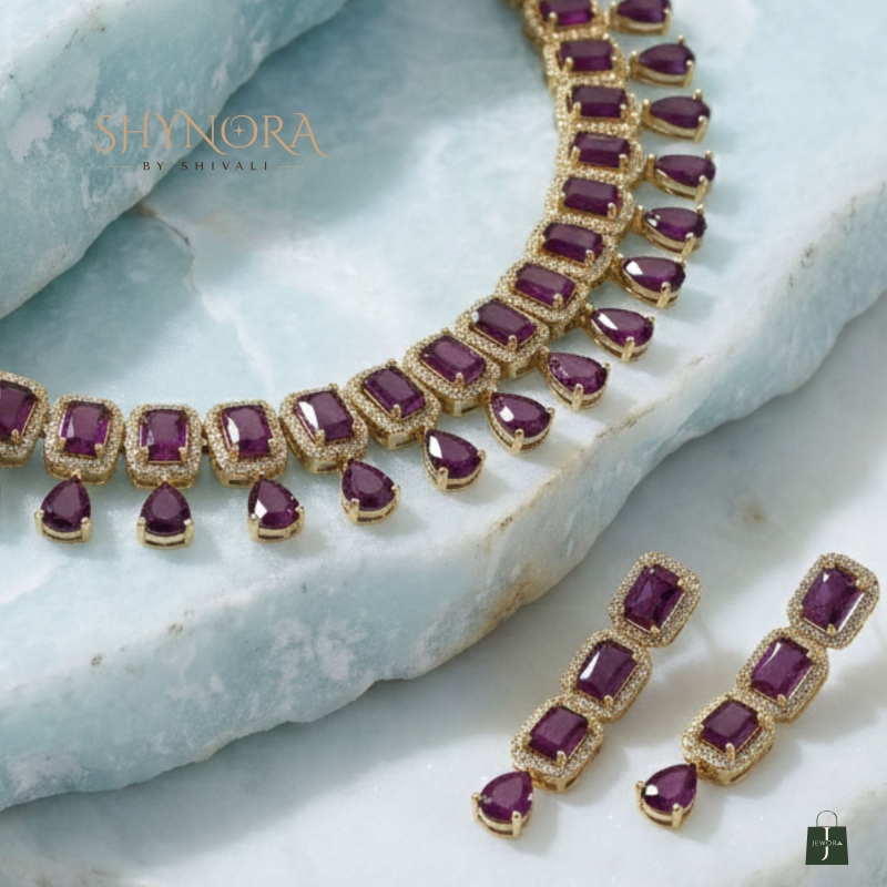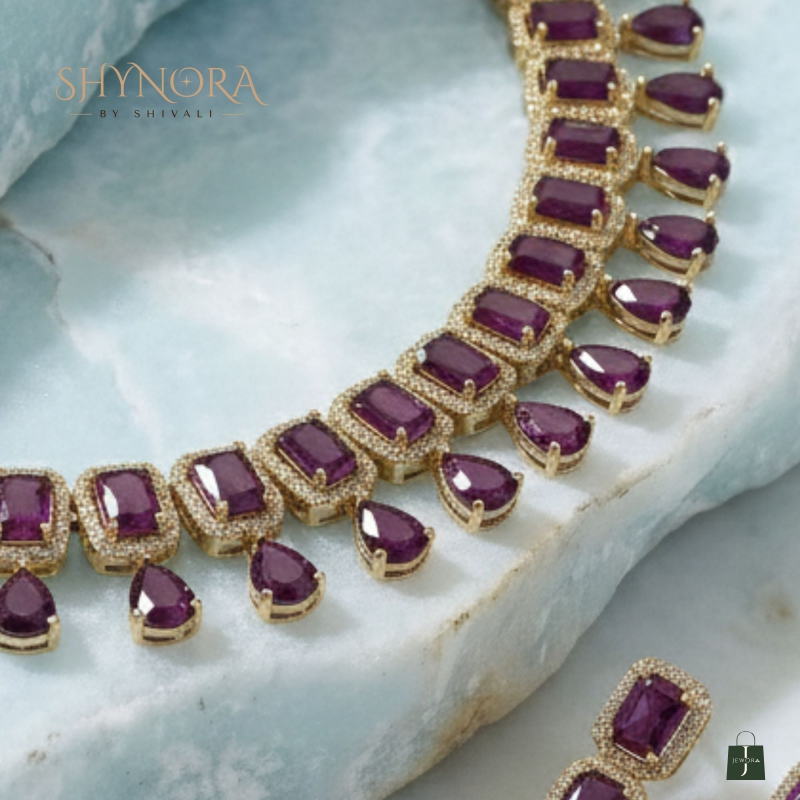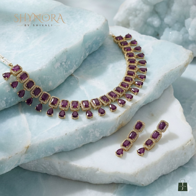 Make a bold yet elegant statement with this Purple AD Stone Choker Necklace Set. Designed with rich purple rectangular stones framed in sparkling American Diamonds, the necklace is beautifully finished with delicate teardrop purple danglers that add graceful movement and charm.