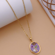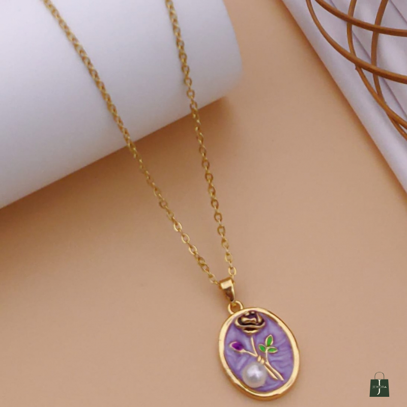 Add a touch of artistic elegance to your jewelry collection with this beautifully designed oval floral pendant necklace. Featuring a sleek gold-tone chain, this necklace highlights a polished oval pendant set in a rich purple enamel base, creating a striking contrast that instantly draws attention. The pendant is adorned with a delicate rose-inspired floral motif, enhanced with subtle green leaf accents and a soft pearl-style bead that adds a graceful finishing touch.