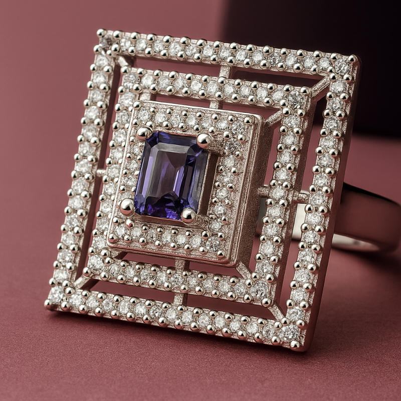 Purple Stone Square AD Ring is an exquisite piece of jewellery designed for women who love bold and elegant statement rings. Featuring a striking purple stone in the center, the ring is surrounded by layers of sparkling American Diamonds (CZ) in a geometric square pattern. Its unique multi-layered design makes it stand out as a luxurious accessory for any occasion. Crafted from high-quality alloy and finished with premium silver plating, this ring combines durability with brilliance. The free-size adjustable band ensures a comfortable fit for every finger, making it a versatile choice. Perfect for party wear, festive occasions, or cocktail evenings, this AD ring adds a touch of glamour to both traditional and modern outfits. A must-have for your jewellery collection, it pairs beautifully with AD earrings, bracelets, or necklaces for a complete look.
