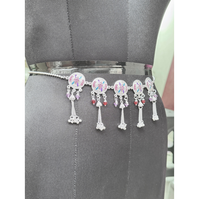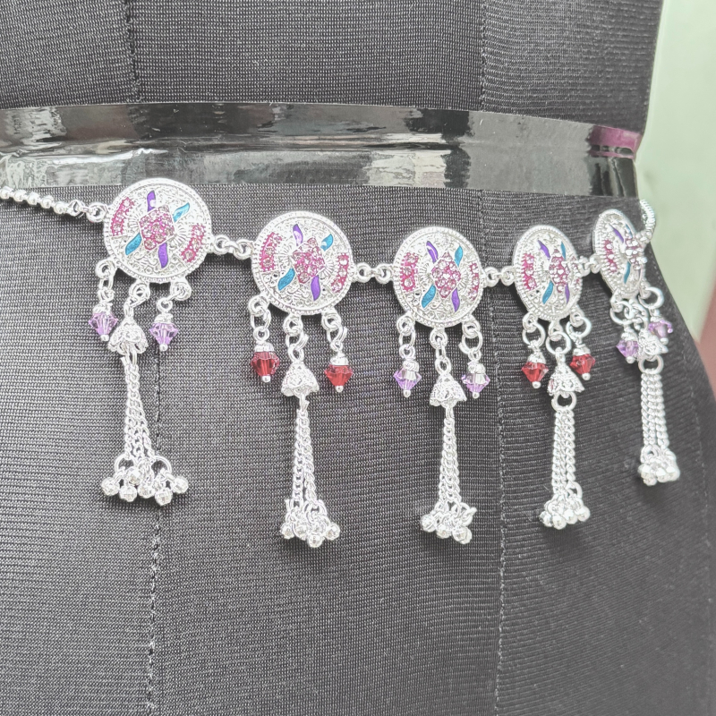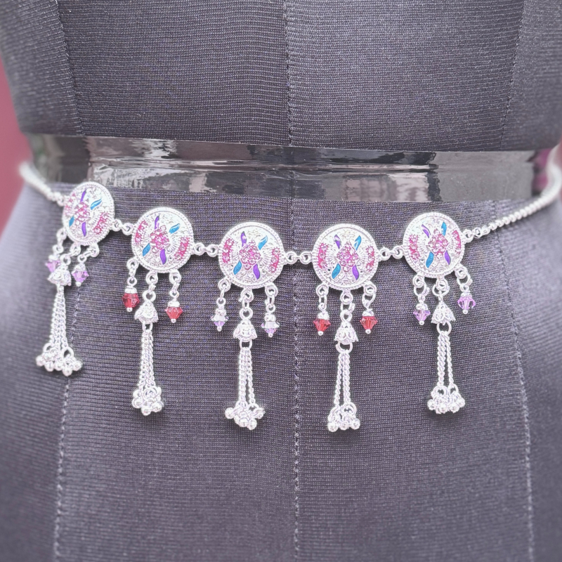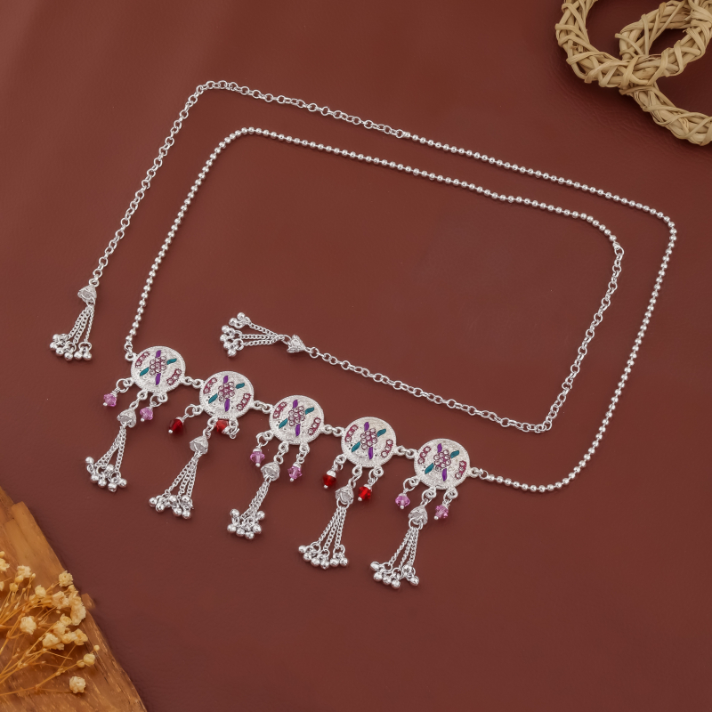 This elegant silver-tone necklace features beautifully crafted round motifs decorated with delicate floral enamel detailing. The vibrant pink and teal accents create a graceful traditional design, while the red and pink crystal bead drops add a touch of color and charm. Each motif is finished with flowing tassel chains that bring movement and elegance to the piece. The dual-chain structure gives the necklace a stylish layered appearance while ensuring a comfortable and adjustable fit, making it perfect for festive occasions and ethnic outfits.