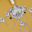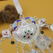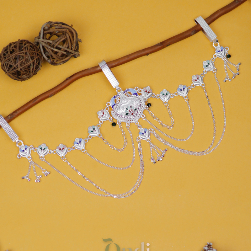 This beautifully crafted oxidised kamarbandh features an intricate floral centerpiece highlighted with delicate multicolor enamel accents. The waistline is adorned with charming leaf and floral motifs, each enhanced with soft pastel enamel detailing that adds vibrancy to the design. Multiple cascading chains drape gracefully across the waist, creating a layered and elegant look. Tiny ghungroo-style danglers add gentle movement and charm, making this kamarbandh a perfect accessory for sarees, lehengas, and festive ethnic attire.