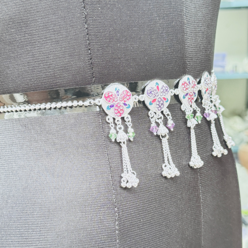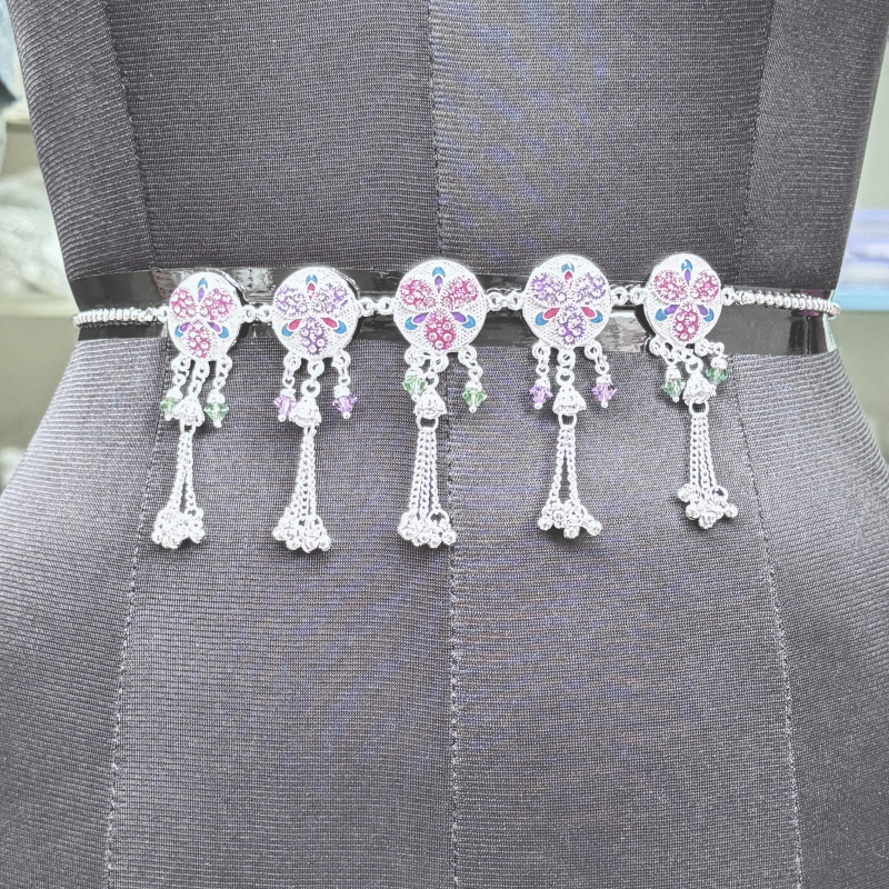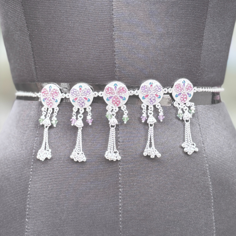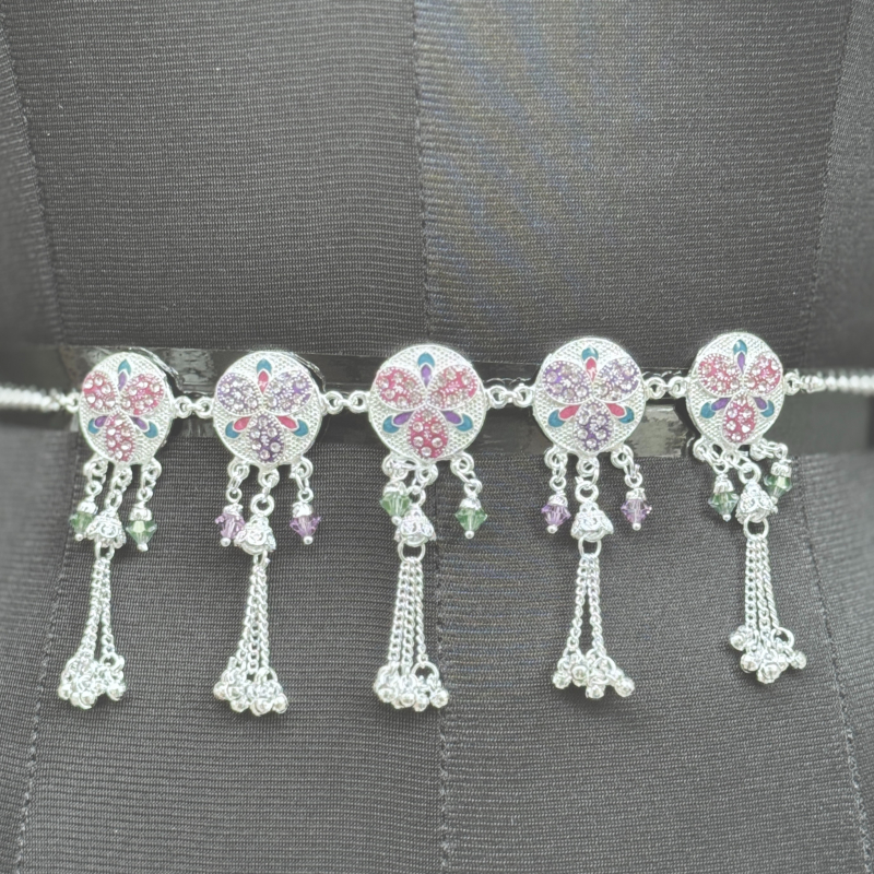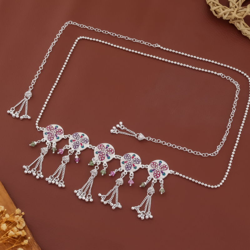 This elegant silver-tone necklace features beautifully crafted round motifs decorated with colorful floral enamel patterns. Each motif is highlighted with vibrant pink and green enamel detailing that creates a lively traditional look. Delicate crystal bead drops and graceful tassel chains add movement and charm to the design. The dual-chain style enhances its modern ethnic appeal while keeping it lightweight and comfortable, making it perfect for festive occasions and ethnic outfits.