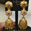The Pushpika Heritage Gold Jhumki beautifully blends floral elegance with traditional charm. Featuring layered flower motifs adorned with ruby-toned accents and delicate stone detailing, the intricately carved dome is finished with classic gold bead danglers. A timeless piece perfect for festive celebrations, weddings, and ethnic ensembles.