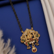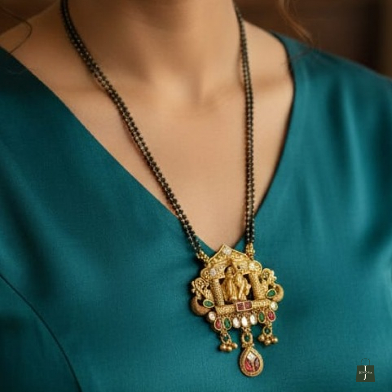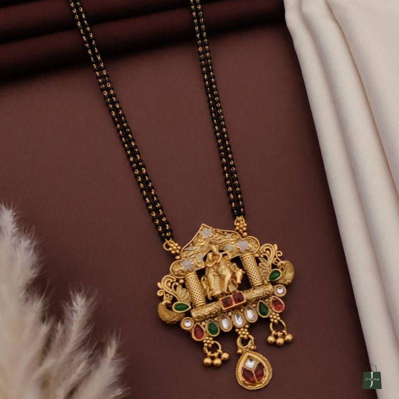 Embrace divine elegance with this beautifully crafted Radha Krishna temple-style mangalsutra necklace. The pendant features an intricately carved idol of Radha and Krishna standing beneath a decorative temple arch supported by detailed pillars. Accented with rich red, green, and white stones along with elegant bead danglers, this piece reflects traditional South Indian temple jewellery artistry. The classic double-line black beaded chain enhances its authentic mangalsutra charm, making it ideal for weddings, festive occasions, and religious celebrations.