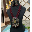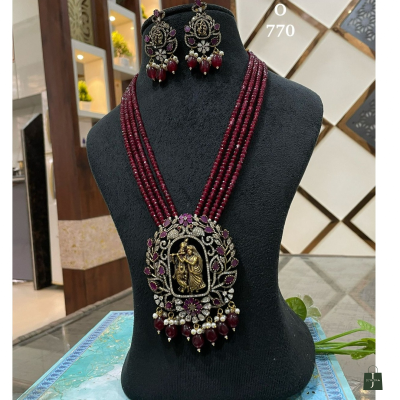 Crafted with deep midnight-blue, green, red beads and a breathtaking Radha–Krishna kundan pendant, this set captures divine romance in every detail. The antique gold finish, intricate handwork, and delicate bead drops create a look that’s both soulful and luxurious.