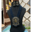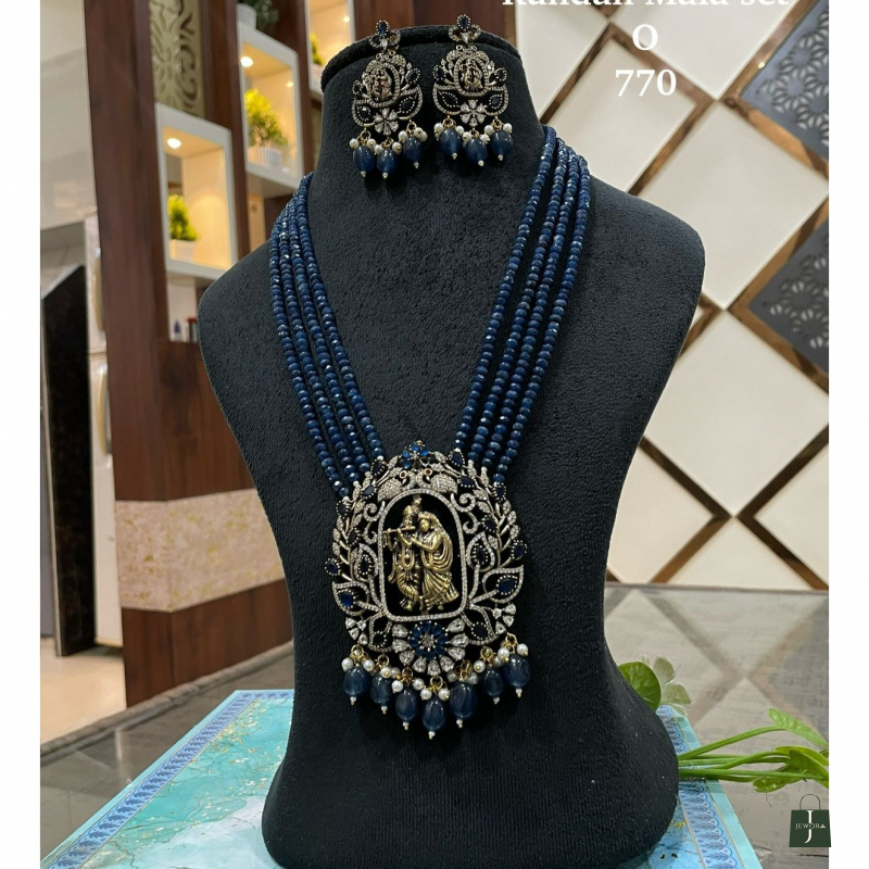 Crafted with deep midnight-blue, green, red  beads and a breathtaking Radha–Krishna kundan pendant, this set captures divine romance in every detail. The antique gold finish, intricate handwork, and delicate bead drops create a look that’s both soulful and luxurious.