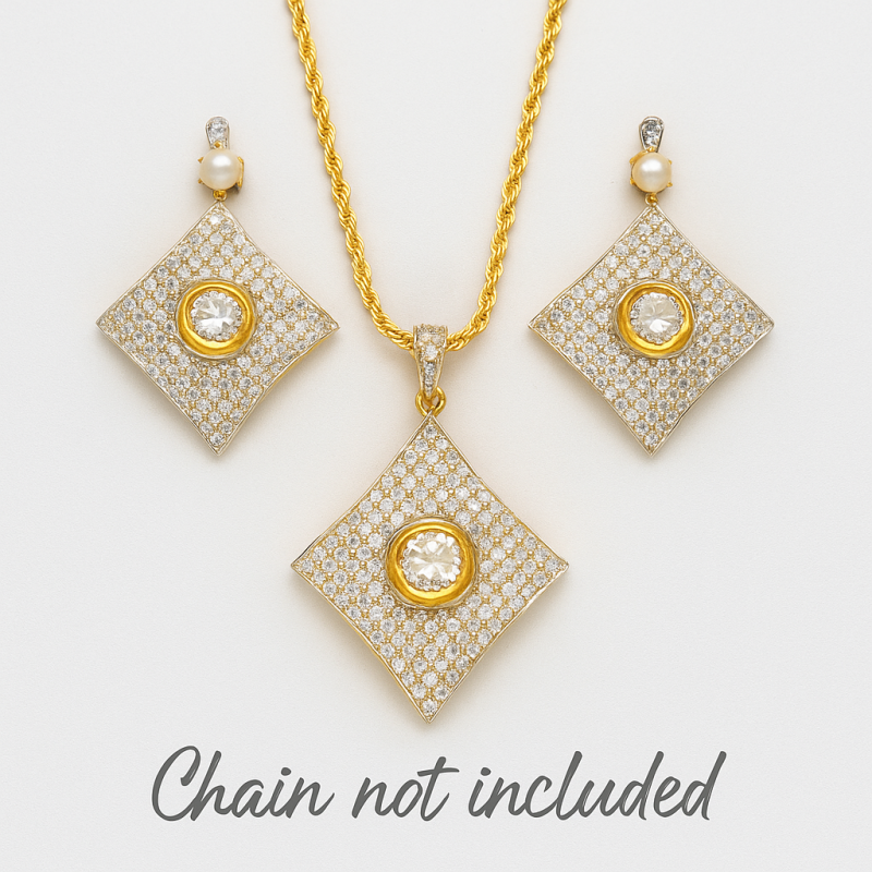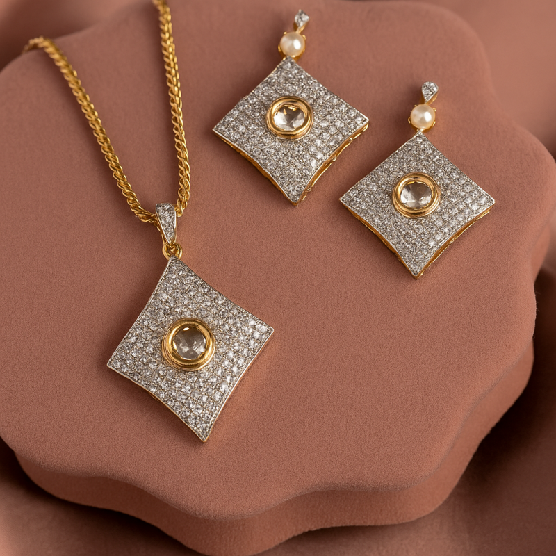 The Radiant Diamond Square Pendant Set is a bold and modern piece designed to make a statement. Featuring a unique square-shaped pendant and earrings, this set is encrusted with sparkling American Diamond (CZ) stones, highlighted by a central round gem framed in gold plating. Its geometric elegance makes it perfect for festive and party wear, while the premium craftsmanship ensures timeless sophistication.