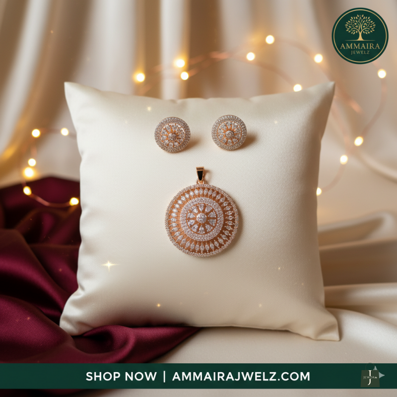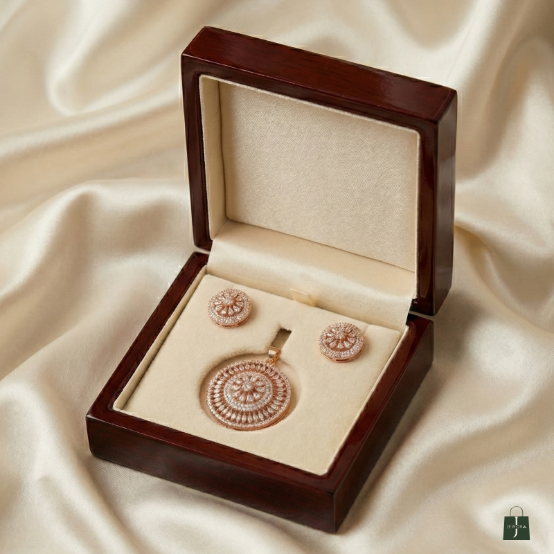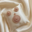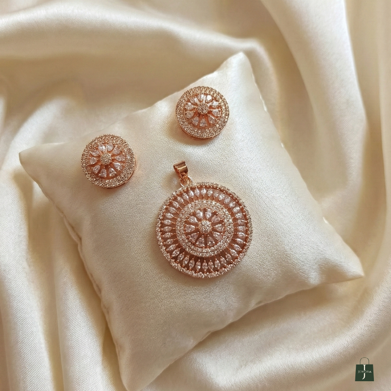 Discover the epitome of elegance with this stunning Rose Gold-Tone Pendant Set. Meticulously crafted with a captivating floral mandala design, this set features high-quality cubic zirconia stones that shimmer from every angle. The matching round stud earrings complement the statement pendant perfectly, making it an ideal choice for festive gatherings, weddings, or adding a touch of glamour to your evening attire. Lightweight yet luxurious, this set is a timeless addition to your jewelry collection.