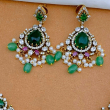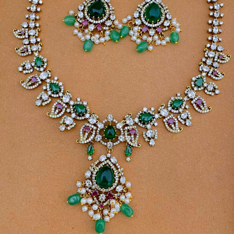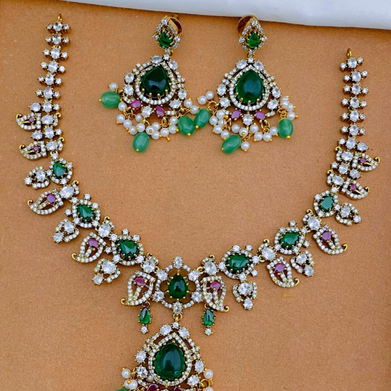 This PVG Horizon CZ gold-plated Mango design necklace set features American Diamonds,rubies and emeralds.This premium imitation jewellery is crafted with meticulous attention to detail,showcasing a harmonious blend of classic design and contemporary style.The Mango motif,a signature of South Indian Heritageadds a touch of cultural richness,making this necklace a standout piece in your jewellery collection.