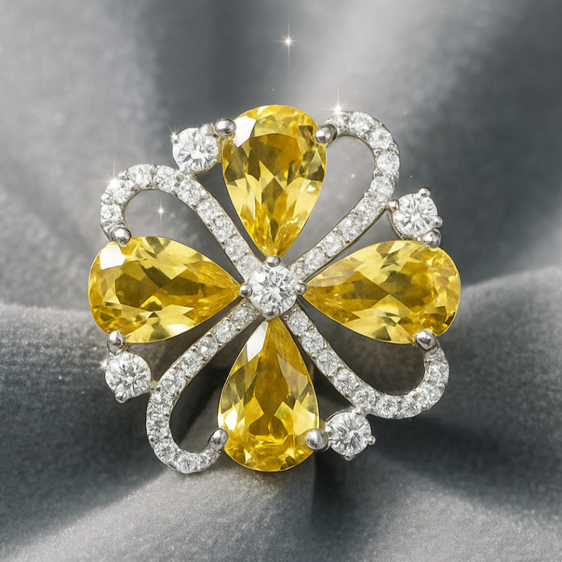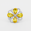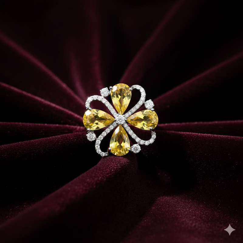 Radiant Yellow Gemstone Bow Statement Ring is a striking designer piece that combines elegance with modern artistry. Featuring large yellow gemstones in a bow-inspired motif, it is outlined with sparkling American Diamonds (CZ) for a luxurious finish. Set in a silver polish, this adjustable cocktail ring is ideal for festive occasions and party wear, making it a glamorous addition to any jewelry collection.