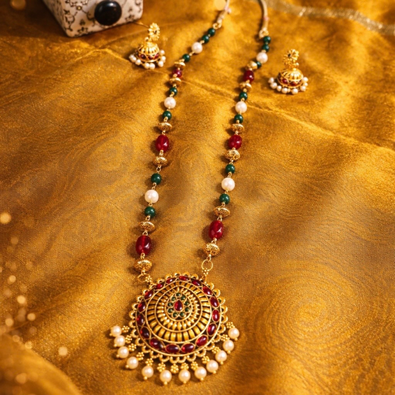 Elevate your look with this elegant statement haar, beautifully handcrafted using luminous shell pearls, rich jade accents, antique-finish beads, and vibrant pink tones. The design is highlighted by a finely detailed temple-style locket, paired with coordinated jhumka elements for a complete traditional appeal.