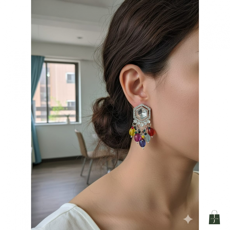 This eye-catching earring features a large, clear, hexagonal crystal at the top, framed by a border of smaller, sparkling stones set in a silver-tone metal. Dangling from the base of the hexagon is a vibrant cluster of multi-colored beads in various shapes, including teardrops and round beads. The colorful drops, in shades of ruby red, sunny yellow, sapphire blue, amethyst purple, and emerald green, create a playful and glamorous cascading effect.