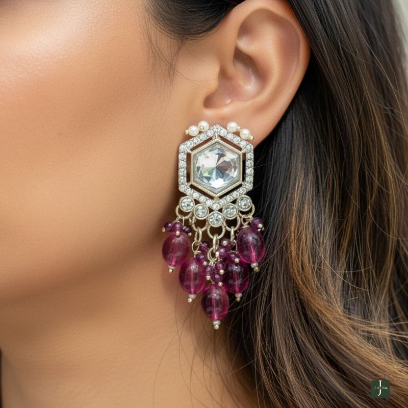 This eye-catching earring features a large, clear, hexagonal crystal at the top, framed by a border of smaller, sparkling stones set in a silver-tone metal. Dangling from the base of the hexagon is a vibrant cluster of multi-colored beads in various shapes, including teardrops and round beads. The colorful drops, in shades of ruby red, sunny yellow, sapphire blue, amethyst purple, and emerald green, create a playful and glamorous cascading effect.