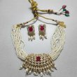 The set includes matching stud earrings featuring a ruby centre, polki outline, and delicate pearl drops — perfectly complementing the necklace for weddings, receptions, and festive celebrations.