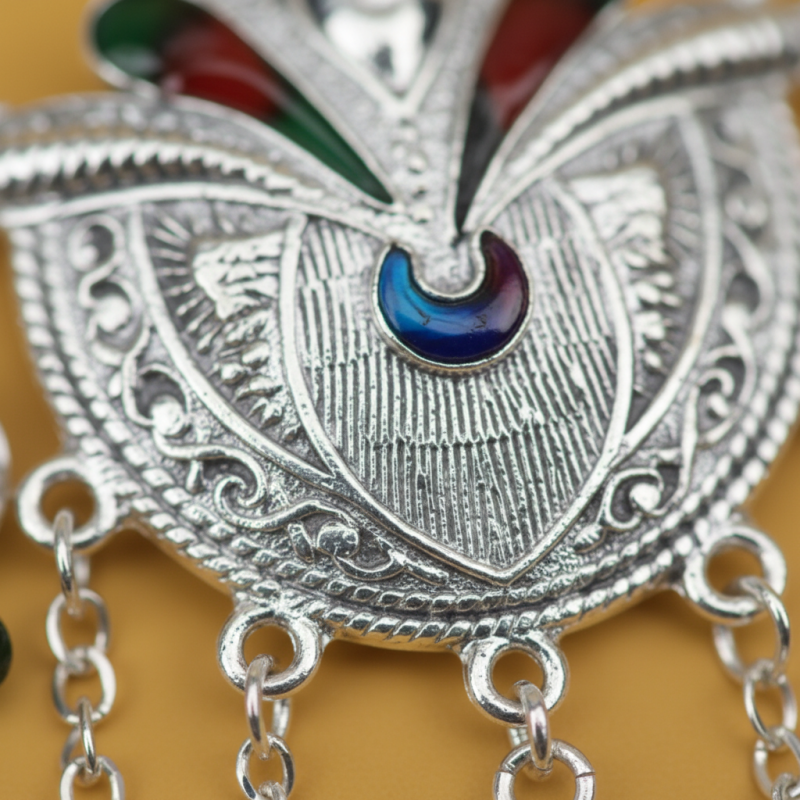 This graceful oxidised kamarbandh features a beautifully crafted royal swan centerpiece, symbolizing elegance and tradition. The waist chain is adorned with delicately engraved round motifs that enhance the classic ethnic appeal of the piece. Flowing layered chains drape across the waist, creating a rich and graceful silhouette. Small dangling charms and bead accents add subtle movement and charm, making this kamarbandh an ideal accessory for sarees, lehengas, and festive ethnic outfits.