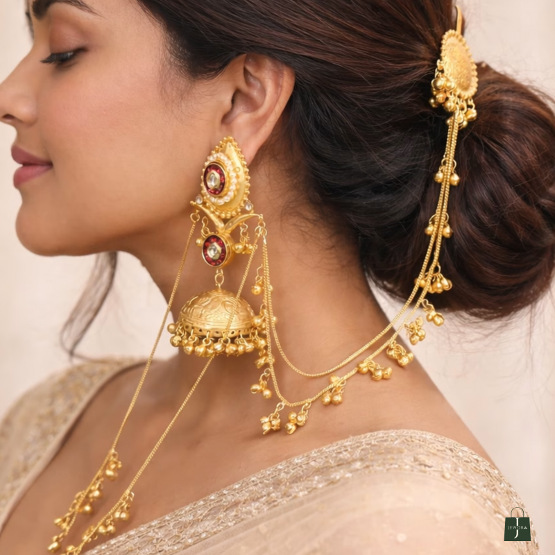 The Rajkumari Gold Finish Ear Chain Jhumka features a classic jhumka connected to delicate gold-tone chains that attach gracefully to the hair, creating a royal, bridal-inspired look.