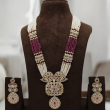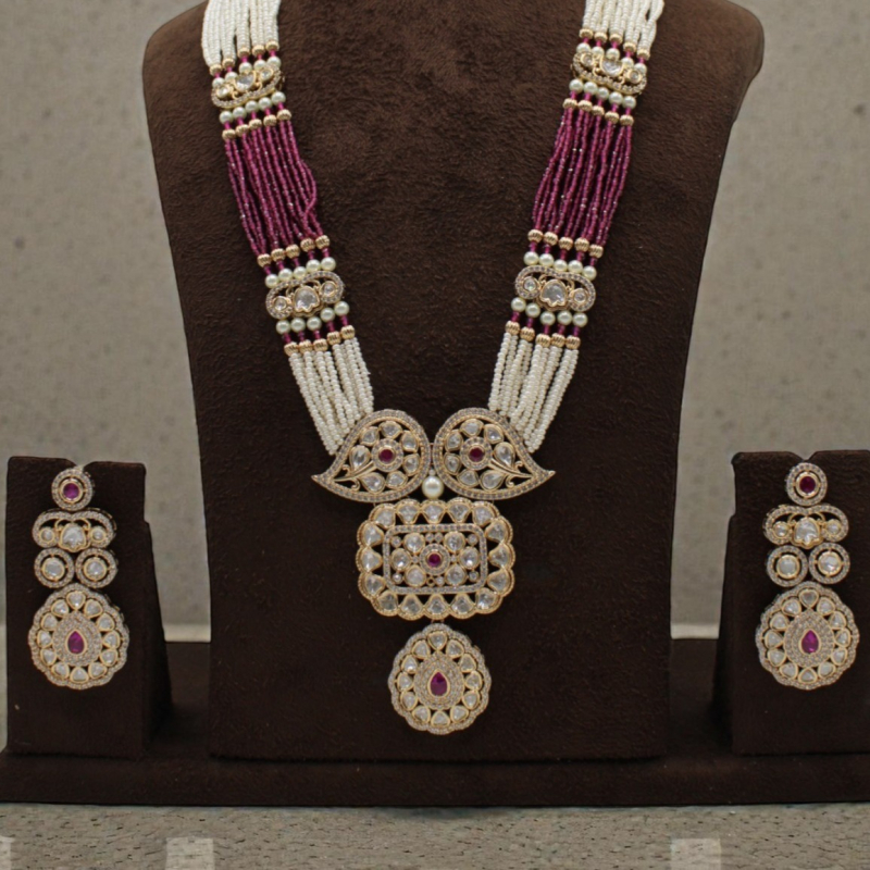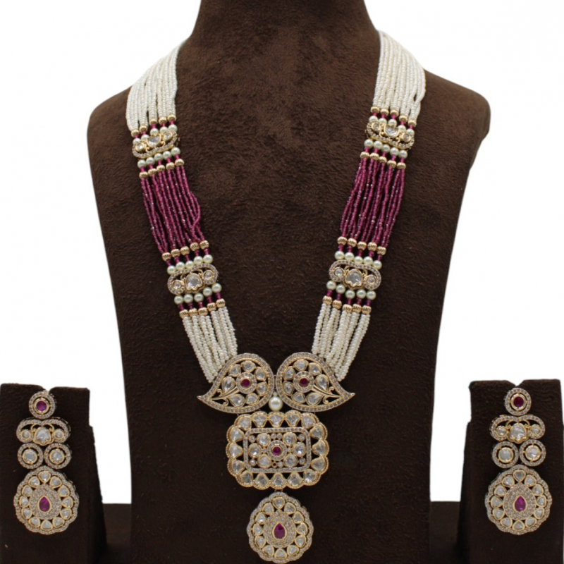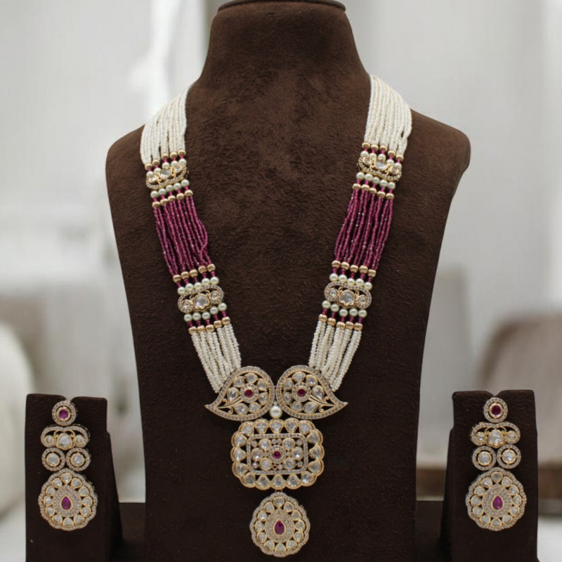 The Rajkumari Ruby Pearl Rani Haar Set is a majestic long necklace inspired by traditional royal jewellery. Designed with multiple strands of fine white pearls and deep ruby-pink beads, this piece creates a striking contrast that enhances its regal appeal.