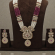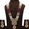 The necklace features intricately crafted kundan motifs on both sides, leading to a grand central pendant adorned with white kundan stones and ruby-pink accents. A delicate drop-shaped pendant dangles gracefully at the bottom, adding movement and elegance. The set includes matching statement earrings that perfectly complement the necklace, making it ideal for bridal and festive occasions.