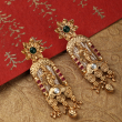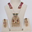 The centerpiece showcases an intricately sculpted deity motif framed within an ornate gold-tone arch, embellished with ruby-toned and emerald-green accents. Sparkling stone detailing and delicate hanging gold beads add a graceful finish, creating a statement piece that commands attention. The matching earrings mirror the pendant’s design, featuring temple-inspired motifs and elegant dangling elements for a perfectly coordinated look.