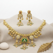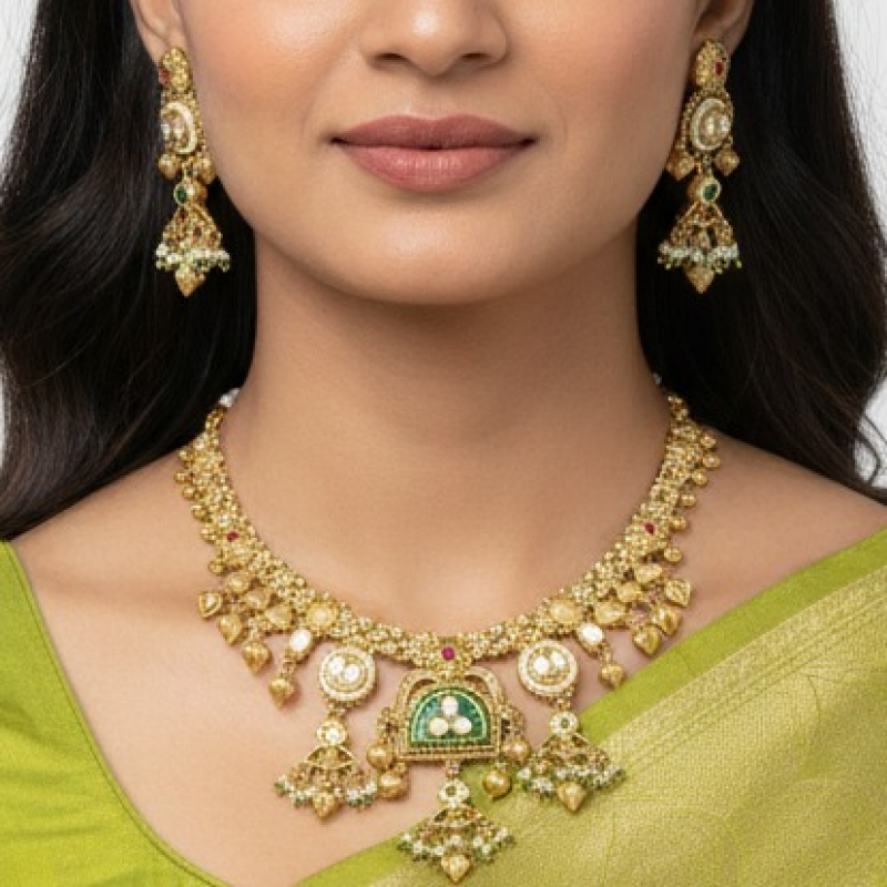 Make a royal statement with this majestic heritage-inspired necklace set crafted in rich antique gold polish. The necklace features intricate temple-style detailing with traditional motifs and layered bead accents. The grand central pendant is adorned with deep ruby red enamel detailing, highlighted with white kundan stones and subtle green accents for a regal finish. Delicate gold bead drops and pearl-green bead hangings add graceful movement and elegance. Paired with matching long dangler earrings, this set is perfect for bridal and festive occasions.