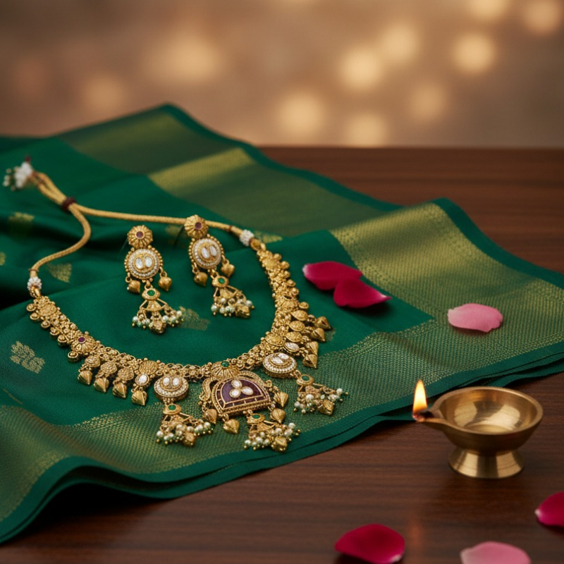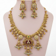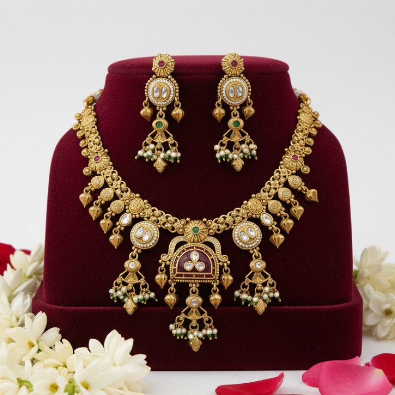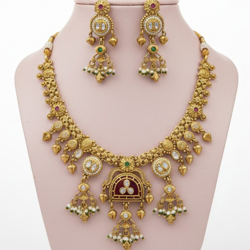 Make a royal statement with this majestic heritage-inspired necklace set crafted in rich antique gold polish. The necklace features intricate temple-style detailing with traditional motifs and layered bead accents. The grand central pendant is adorned with deep ruby red enamel detailing, highlighted with white kundan stones and subtle green accents for a regal finish. Delicate gold bead drops and pearl-green bead hangings add graceful movement and elegance. Paired with matching long dangler earrings, this set is perfect for bridal and festive occasions.
